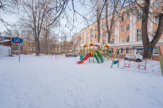 Двор огорожен (въезд через шлагбаум), вокруг много зелени, детская площадка и парковка.